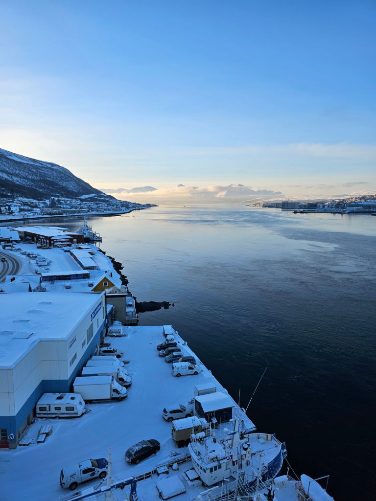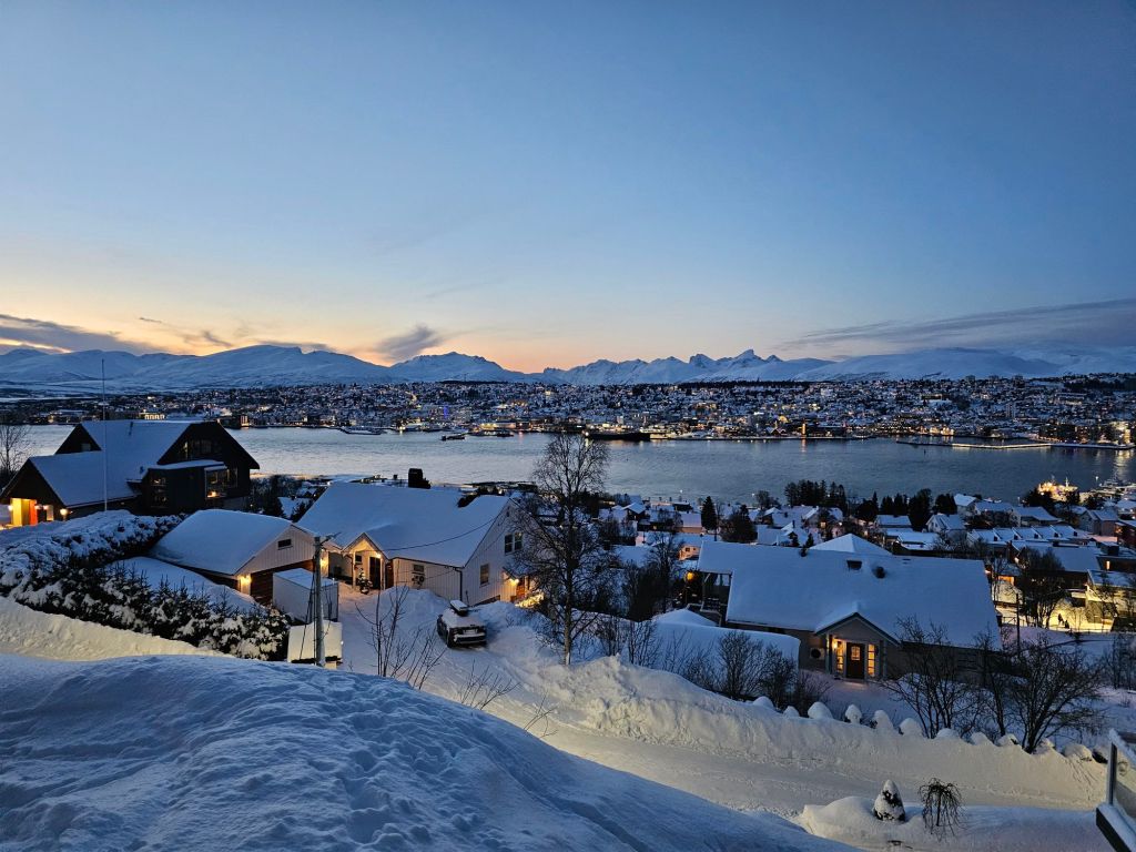 We finally made it up Fjellheisen. The view from the top is unreal — Tromsø glowing below with mountain layers stretching out behind. We hiked up to the highest viewpoint and watched the city light up. A faint aurora drifted behind us.